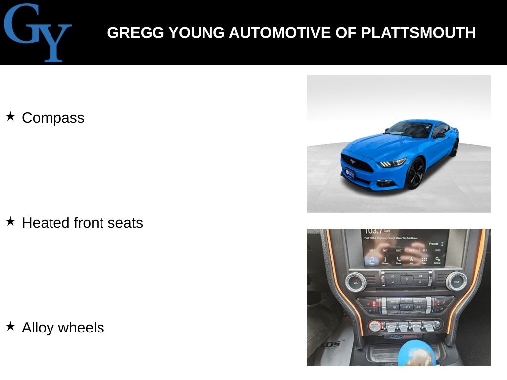 Serving up all-American good looks and incredible performance, our **2017**Ford**Mustang**EcoBoost Premium**Fastback**Heated and Cooled Seats**SYNC** is irresistible in Grabber Blue! Powered by a TurboCharged 2.3 Liter EcoBoost 4 Cylinder that offers 310hp tethered to a responsive 6 Speed Automatic transmission. It's amazingly agile and delivers a crisp, responsive driving experience and nearly 30mpg on the highway. Check out the timeless good looks of our EcoBoost Premium Fastback with its iconic curves that ignite a sense of adventure. Take note of the beautiful alloy wheels, LED fog lights, Pony projection lights, and HID headlamps with signature lighting.