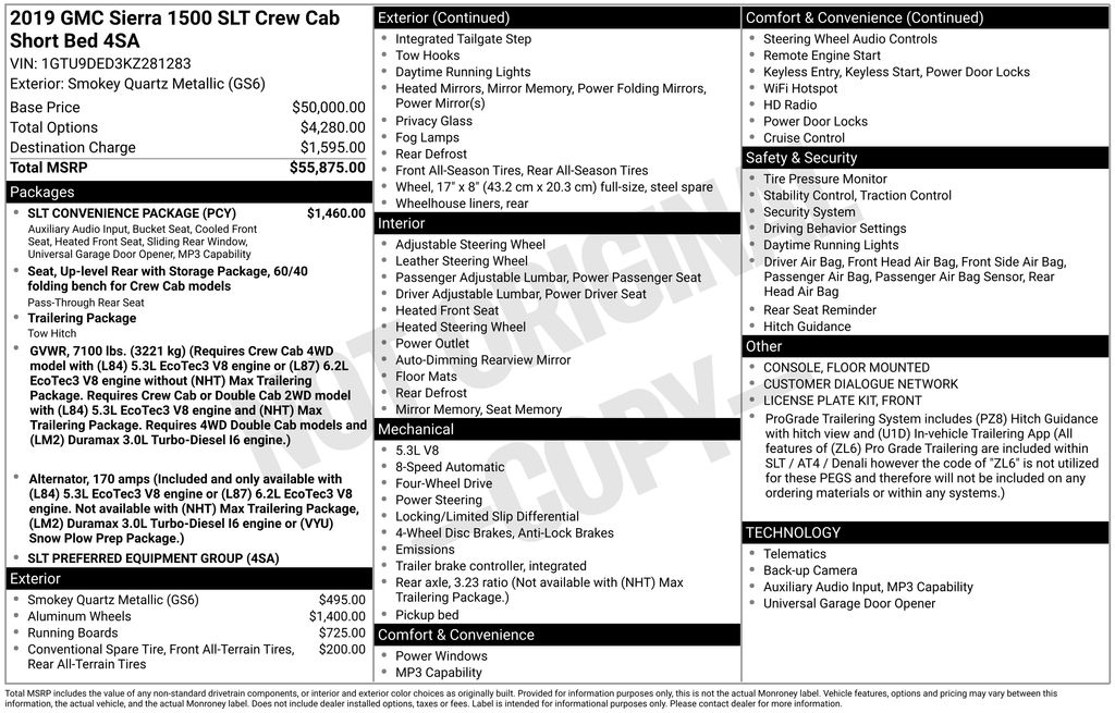Dare to turn heads in our terrific **2019**GMC**Sierra 1500**SLT**Crew Cab**4X4**Tonneau Cover**Assist Steps** that's presented in Smokey Quartz Metallic! Powered by a 5.3 Liter EcoTec3 V8 providing 355hp paired with an 8 Speed Automatic transmission for easy capability. This Four Wheel Drive truck is ready for almost anything Mother Nature offers and rewards you with nearly 23mpg on the highway. Ruggedly handsome, our Sierra combines impressive style and functionality with LED lighting, fog lamps, assist steps, a tonneau cover, alloy wheels, and the GMC MultiPro tailgate for amazing versatility.