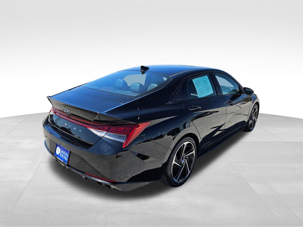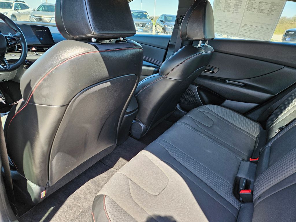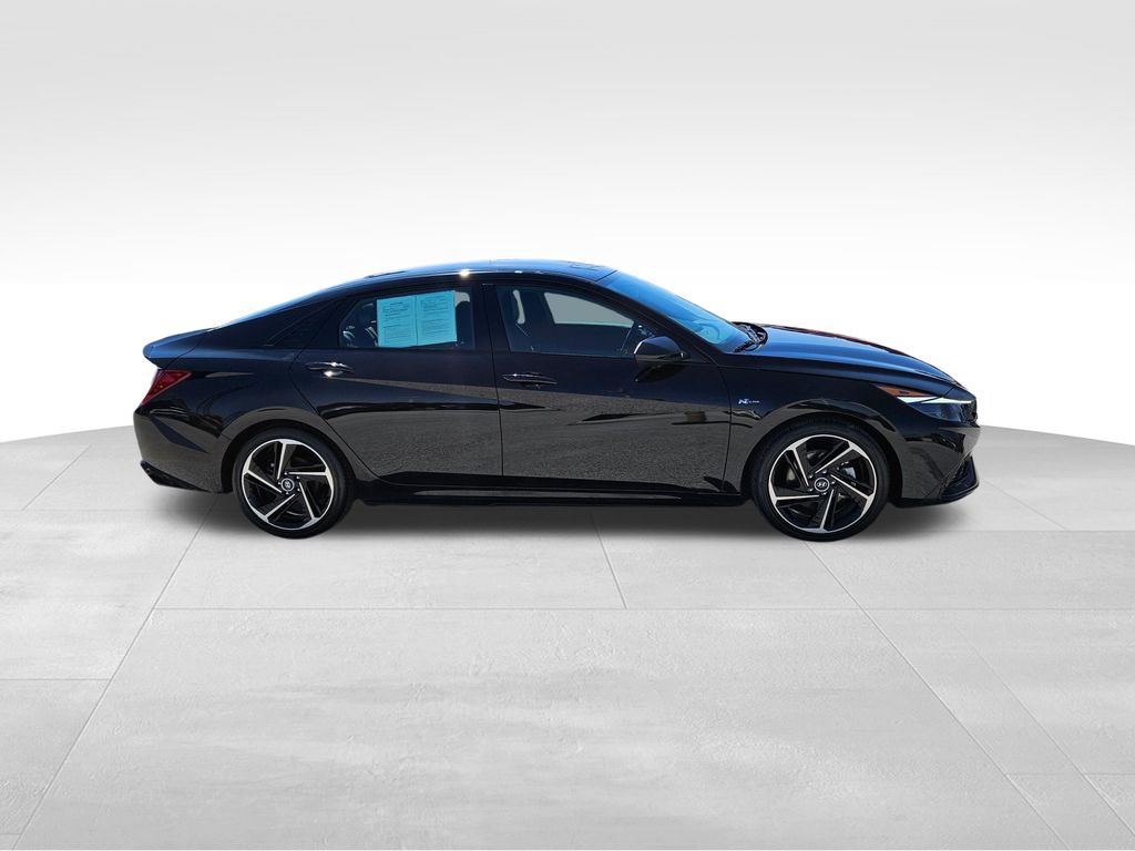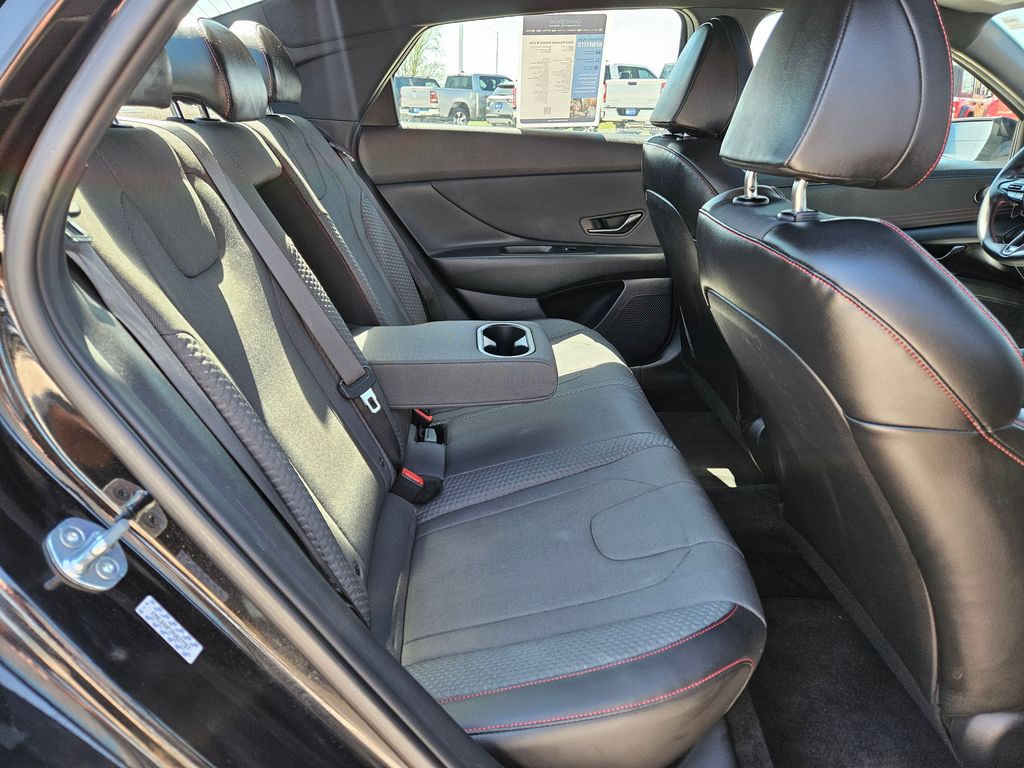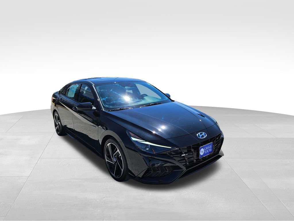 Our fierce One Owner, Accident Free 2023 Hyundai Elantra N Line Sedan is fantastically fun to drive in Black! Powered by a TurboCharged 1.6 Liter 4 Cylinder that supplies 201hp connected to a paddle-shifted 7 Speed Dual-clutch Automatic transmission for dynamic acceleration. This Front Wheel Drive sedan also has athletic handling, and it returns nearly 36mpg on the highway with a spirited sport-compact design. Just check out the way our Elantra blends its unique N Line gloss-black grille, bumpers, and rear diffuser with LED lighting, a power sunroof, a hands-free trunk, alloy wheels, heated power mirrors, and twin chrome exhaust outlets.