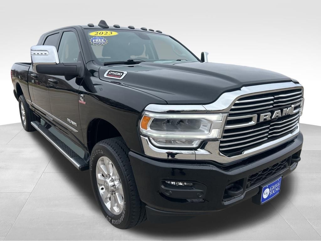 Owners love our Diesel powered One Owner, Accident Free 2023 RAM 2500 Laramie Mega Cab 4X4 with the Level 1 Pack for its bold comfort and capability in Diamond Black Crystal Pearl! Motivated by a TurboCharged 6.7 Liter Cummins Diesel 6 Cylinder providing 370hp and 850lb-ft of torque to a 6 Speed Automatic transmission. A heavy-duty suspension also helps this Four Wheel Drive truck maintain its composure even when hard at work. Dynamic and distinctive, our RAM features premium alloy wheels, a chrome grille, painted bumpers, a Class V receiver hitch, and our Level 1 Pack's remote release tailgate, LED lighting, and fog lamps.