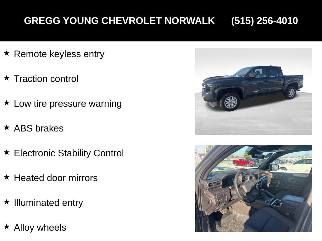 For safer trucking, Toyota supplies Proactive Driving Assist, complemented by automatic braking, adaptive cruise control, a rearview camera, lane-keeping assistance, and more. With all that, our Tacoma is a legendary leader that owners love! Save this Page and Call for Availability. We Know You Will Enjoy Your Test Drive Towards Ownership! We offer PRE-APPROVAL programs so call (515) 256-4010 to get started today! At Gregg Young Chevrolet... We'll Go The Extra Mile For You. We have an app for that! Download the Gregg Young Chevrolet application directly to your iPhone or Android.